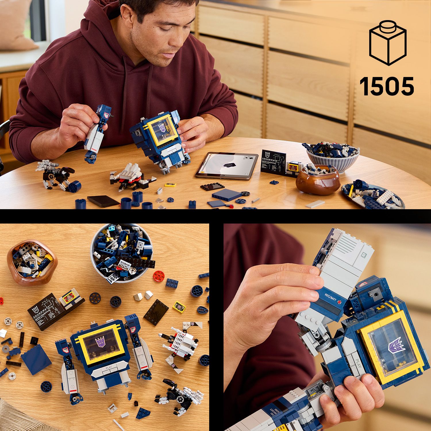 LEGO Icons Transformers: Soundwave (10358) ist ein detailreiches Modellbau Set für Erwachsene, das Fans der legendären Transformers-Reihe begeistert. Mit dieser ikonischen Roboterfigur entstehen nicht nur nostalgische Erinnerungen, sondern auch eine außergewöhnliche LEGO Dekoration für Wohnzimmer, Regal oder Schreibtisch – als Geschenk für Männer und Frauen, die Technik und Design lieben.