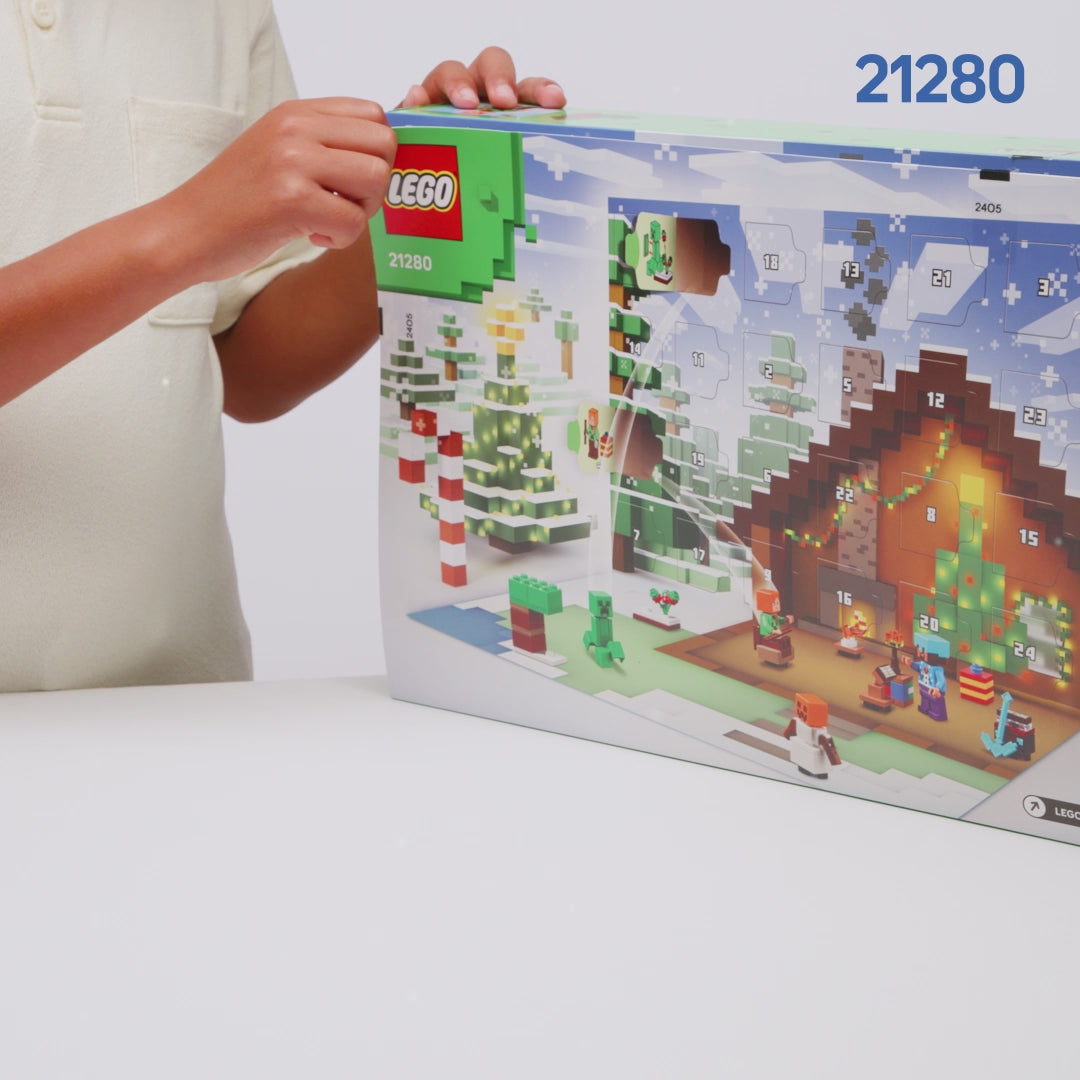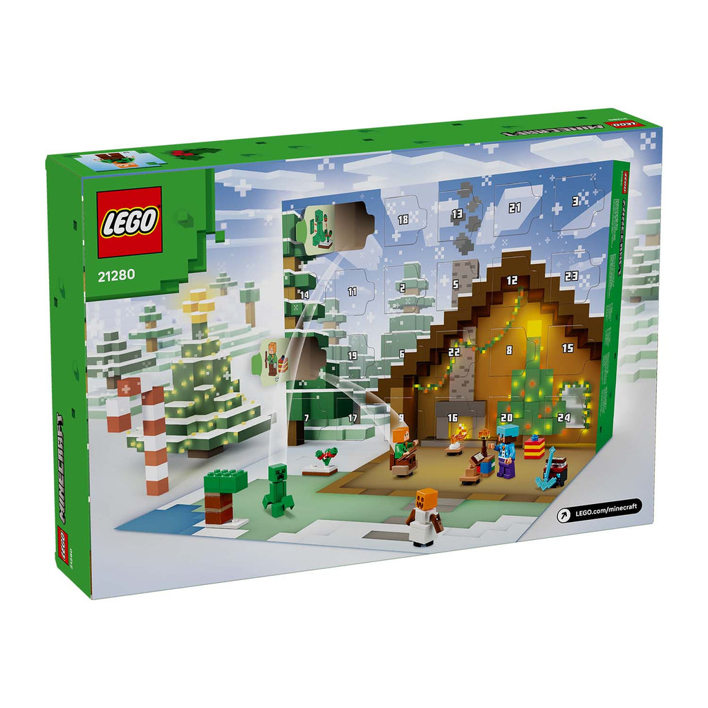 Enthalten sind zahlreiche LEGO Minecraft Figuren wie Alex im Creeper-Pullover, Steve mit Diamanthelm, ein Schneegolem, ein Streuner in Diamantrüstung, ein Zombie mit Axt und ein Weihnachtsmann-Dorfbewohner mit Ofen. Auch ein Ertrunkener mit Dreizack und ein Creeper neben einem Süßbeerenstrauch gehören zum Set. Dazu kommen viele kleine Modelle und Minecraft Zubehör, das Kinder aus dem Spiel wiedererkennen.
