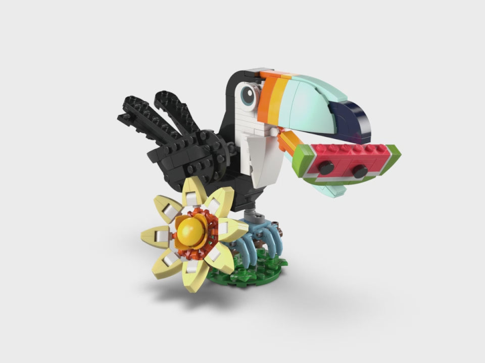 Der Spielzeugtukan sitzt auf einem Ast, der von einer großen Blume aus LEGO Steinen geschmückt wird. Der LEGO Vogel kann seine Flügel, den Schnabel und die Schwanzfedern bewegen – und pickt dabei genüsslich in ein Stück Wassermelone. Das Modell kombiniert farbenfrohes Design mit cleveren Funktionen, die Kinder immer wieder zum Spielen einladen.