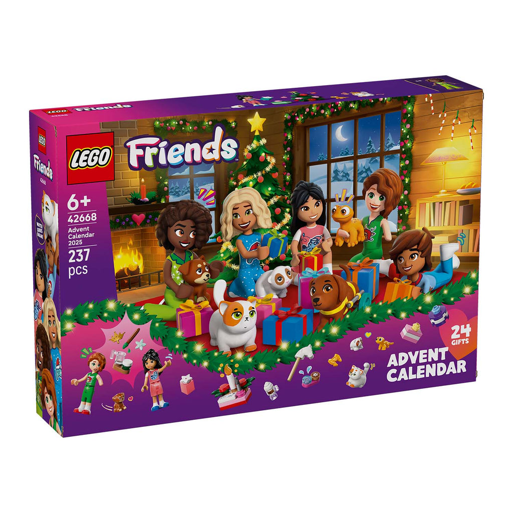 Hinter den 24 Türchen verbergen sich 5 LEGO Friends Figuren (Aliya, Autumn, Liann, Nova und Leo), sowie 5 Tiere, darunter 2 Hunde, eine Katze, ein Gecko und ein LEGO Friends Meerschweinchen. Die Kinder können mit den Figuren Wunschzettel schreiben, Karaoke singen, heiße Schokolade machen oder den Weihnachtsbaum schmücken. Zubehör wie Matratzen, Sofa, Kamin, Geschenke, ein Schlitten und ein Plüsch-Rentier ergänzen das Spielerlebnis.