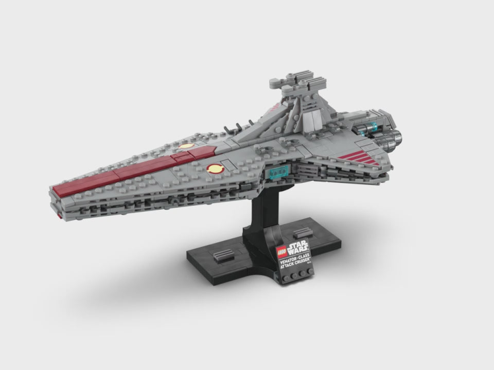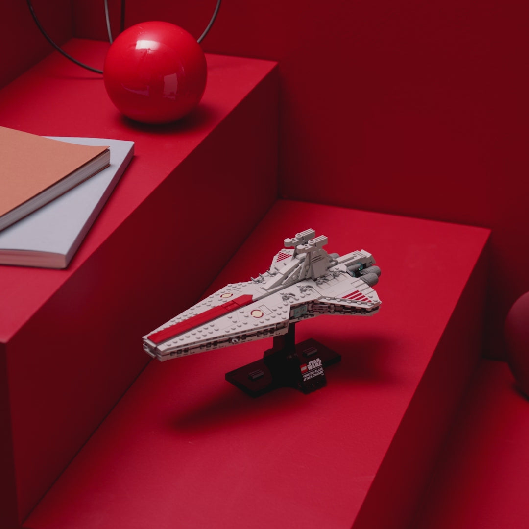 AUTHENTISCHE REPUBLIK-DETAILS: Die markante Form und die roten Markierungen des Venators spiegeln ein wichtiges Schiff aus den Klonkriegen wider und sprechen Fans der Prequel-Ära an