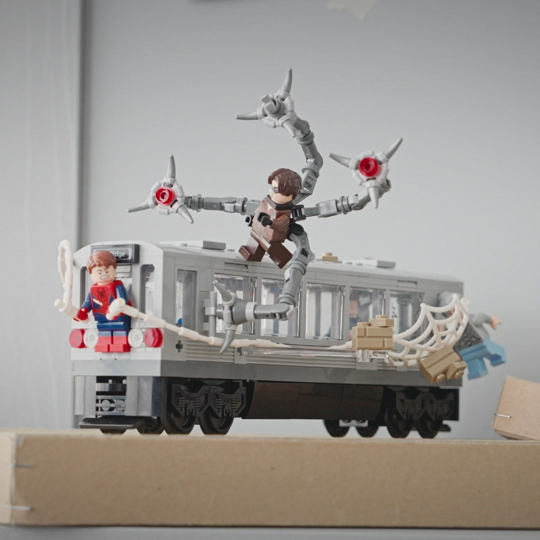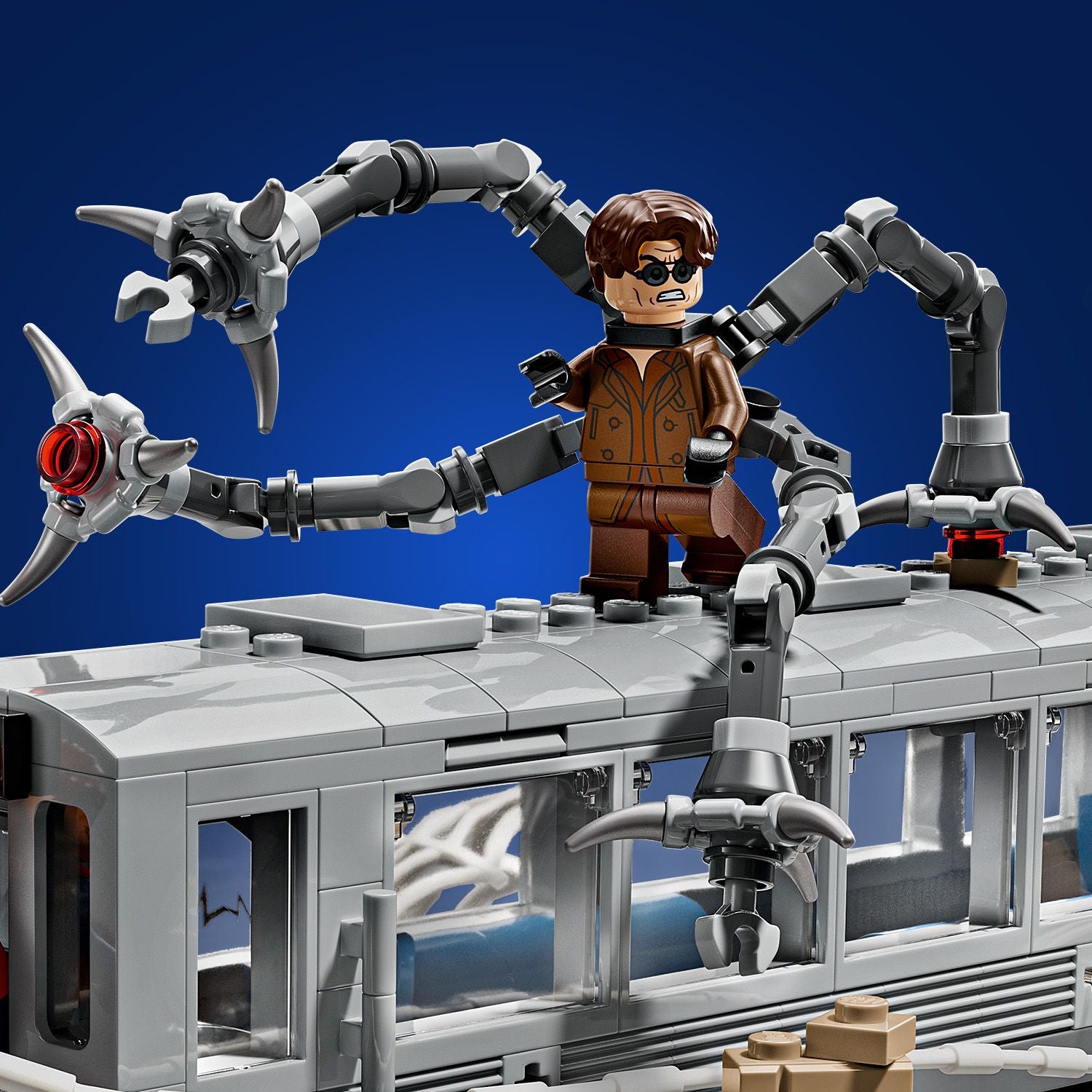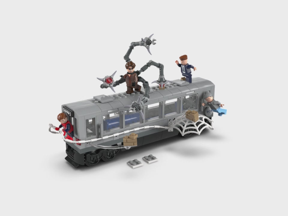 Zum Set gehören LEGO Minifiguren von Spider-Man (mit austauschbaren Köpfen für maskiertes oder unmaskiertes Spiel), Doc Ock mit vier beweglichen Tentakeln und zwei Laserstrahlen, Aunt May und J. Jonah Jameson. Spider-Man kann sein Netz direkt am Zug befestigen, während Doc Ock die Tentakel an den Wagen anklippt, das sorgt für dynamische Spielszenen und reichlich Bewegung. Das Zugdach lässt sich abnehmen, sodass die LEGO Figuren leicht platziert werden können.