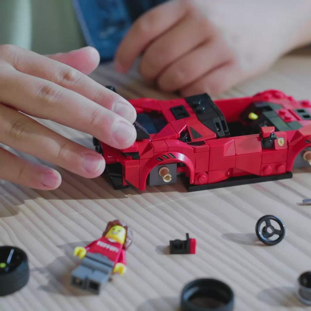Das LEGO Ferrari Modell punktet mit einem zentralen Cockpit, markantem Heckflügel, realistischen Auspuffrohren und Felgen mit dem berühmten Ferrari-Logo. Im Lieferumfang enthalten ist auch eine Minifigur in offizieller Ferrari-Rennkleidung – mit Helm –, die im Cockpit Platz nehmen kann. Ob als Ausstellungsstück oder für actionreiche Rennen im Kinderzimmer: Dieser kleine LEGO Sportwagen zieht alle Blicke auf sich.